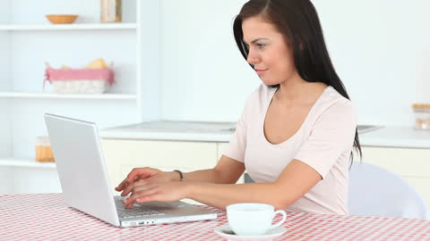 Man Smiling While Using Laptop In Bright Kitchen Videos