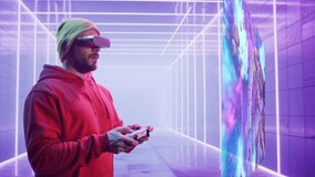 Man Using Vr Headset With Virtual Data Projection Videos