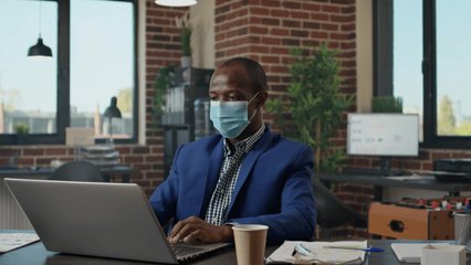 Man Wearing Face Mask While Binary Code Projects Over Screen Videos