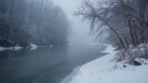 Misty Winter River Flowing Past Snowy Bank With Thin Ice Forming For Atmospheric B Roll Videos