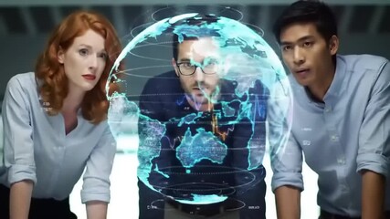Multicultural Professionals Analyzing Data Projections With Holographic Interface Videos