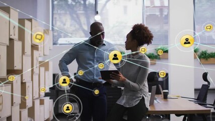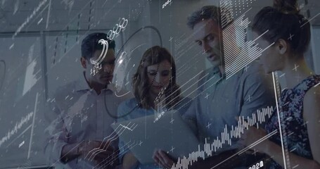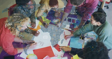 Multiracial Team Collaborating On Digital Project With Network Overlay Videos