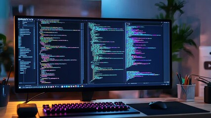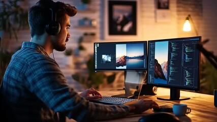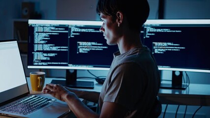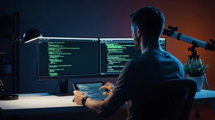 Night Developer Coding On Dual Monitors At Home Office Video Focused Programmer Typing Code Videos