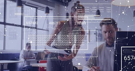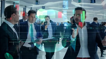 Office Team Collaborating On Digital Project With Overlaid Data Visualization Videos