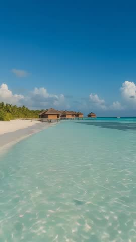 Panning Reveal Overwater Thatched Bungalow With Daybed And Steps Into Turquoise Lagoon Videos