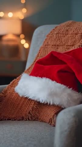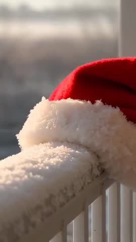 Panning Shot Revealing Red Santa Hat Resting On Snowy Balcony Railing At Sunrise With Soft Bokeh Videos
