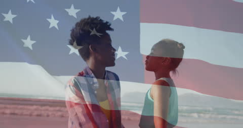 Patriotic Reflection Smiling Man Enjoying Beach With Smartphone Videos