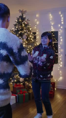 Santa Hat Resting On Wood Floor Under Warm String Lights With Falling Snow Vertical Holiday Clip Videos