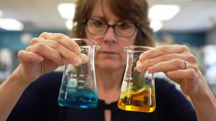 Scientist Analyzing Liquids In Laboratory Beakers Videos