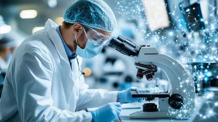 Scientist Examining Microscope With Futuristic Digital Overlay Videos