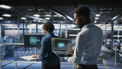 Scientists Analyzing Data Visualization In Server Room Videos