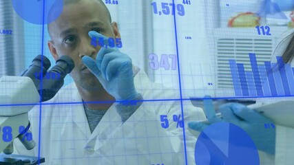 Scientists Analyzing Data With Microscopes And Digital Overlay Videos