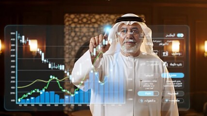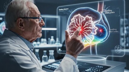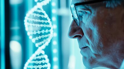 Senior Man Analyzing Data Visualizations On Virtual Screen Videos