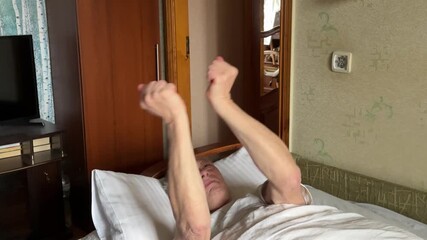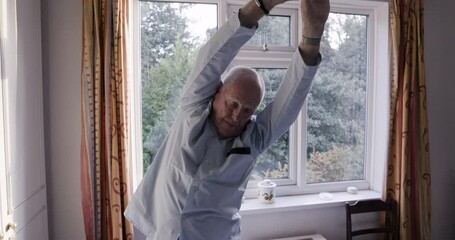 Senior Man Stretching In Bedroom For Morning Exercise Routine Videos