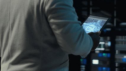 Server Room Worker Analyzing Digital Icon Overlays Videos