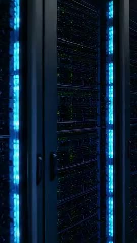 Sliding Down Datacenter Corridor Revealing Blue Rack Leds And Overhead Lights Vertical Video Videos