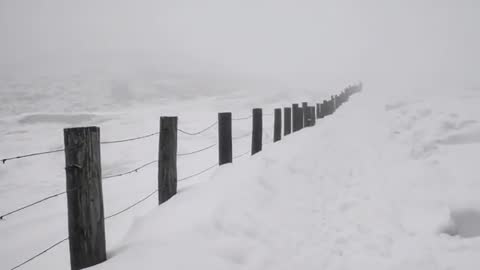 Slow Tracking Shot Over Snowy Field Following Barbed Wire Fence Posts Receding Into Dense Fog Videos