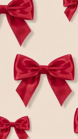 Slow Zooming Over Red Satin Bows Pattern On Pale Beige Background For Festive Wrapping Videos