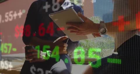 Smiling Business Professional Navigating Digital Tablet With Technology Overlay Videos