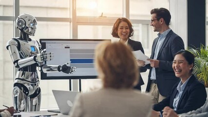 Smiling Business Team Analyzing Data In Bright Office Videos