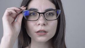 Smiling Model Adjusting Sunglasses While Camera Pulling Back Stylish Eyewear Close Up Video Videos