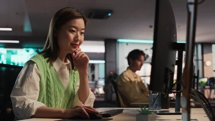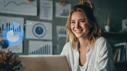 Smiling Woman In Office With Digital Business Analytics Graphics Videos