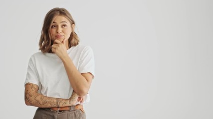 Smiling Woman Revealing Copy Space On Isolated White Background Videos
