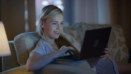 Smiling Woman Typing On Laptop While Lying On Sofa In Living Room Videos
