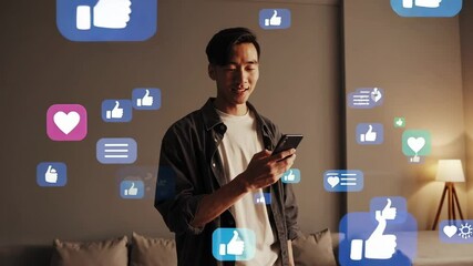 Smiling Young Man Using Smartphone With Futuristic Digital Network Icons Videos