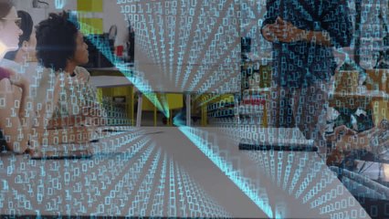 Students Analyzing Data With Overlay Of Binary Code Videos