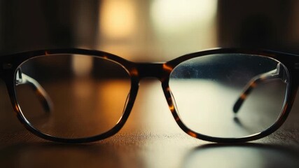 Stylish Eyeglasses On Elegant Wooden Desk With Illuminated Background Videos