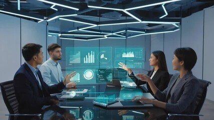 Team Analyzing Data With Futuristic Transparent Screen Technology Videos