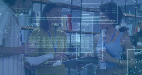 Team Collaborating On Tablet With Data And Graphs Overlay Videos