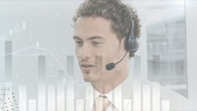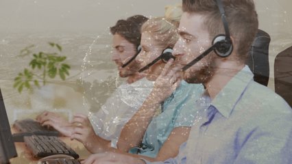 Team Using Headsets With Data Processing Graphics Overlay Videos