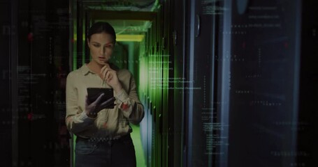 Technician Analyzing Data With Binary Code Overlay In Data Center Videos