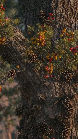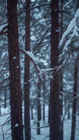 Tilting Vertical Video Capturing Towering Pine Trunks And Misty Canopy In Mountain Forest Videos