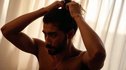 man tying hair