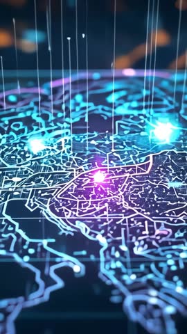 Vertical Neon Waveform Traveling Across Holographic Grid With Glowing Node And Circuitry Videos