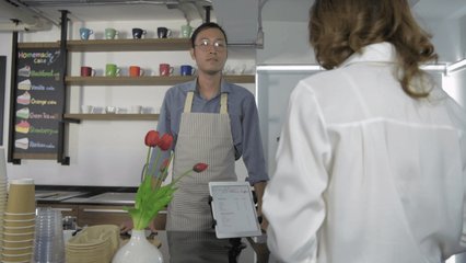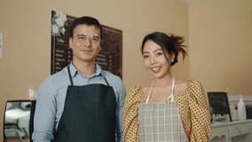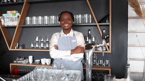 Vertical Video Smiling Barista Greeting Camera While Pulling Back In Cozy Cafe Videos