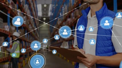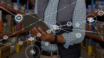 Warehouse Worker Coordinating Inventory With Technology Icons Videos