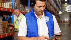 Warehouse Worker On Phone With Technology Network Overlay Videos