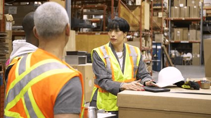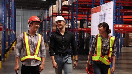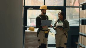 Warehouse Workers Discussing Amidst Digital Tech Overlay Videos