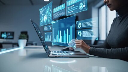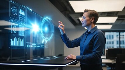 Woman Analyzing Holographic Data In Futuristic Office Environment Videos