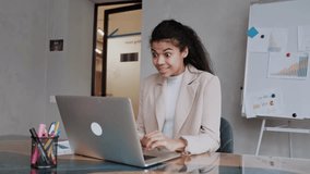 Woman Software Developer Celebrating Code Success Smiling With Arms Raised At Workstation Videos