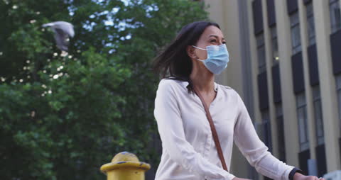 Woman Wearing Mask Reviewing Notes Amidst Overlayed Data Graphics Videos