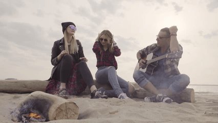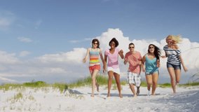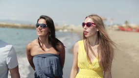 Young Friends Laughing On Beach With Financial Data Overlay Videos