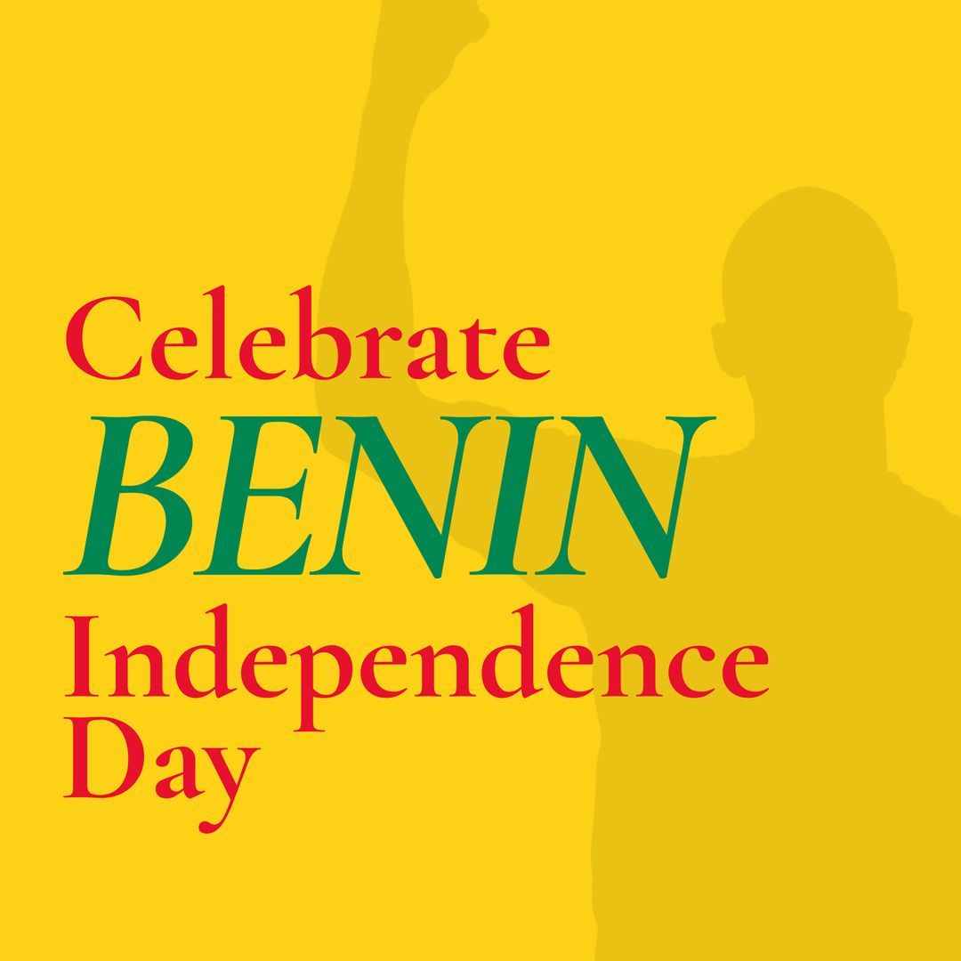 This illustration features the phrase 'Celebrate Benin Independence Day' on a vibrant yellow background. A silhouette of a person raising their hand embodies a spirit of patriotism and freedom. This graphic underscores national pride and cultural identity suitable for social media promotions, event advertisements, or educating audiences about Benin’s history and independence celebrations.
