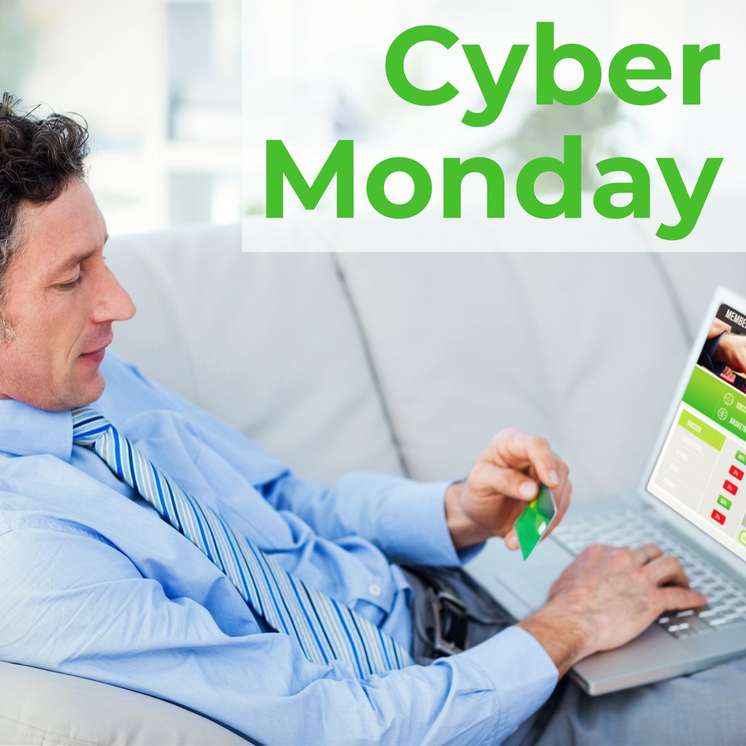 A businessman is using a credit card while browsing a laptop, symbolizing Cyber Monday. The image is ideal for promoting online shopping deals, illustrating e-commerce articles, or advertising digital marketplace services, especially during online sale events like Cyber Monday.