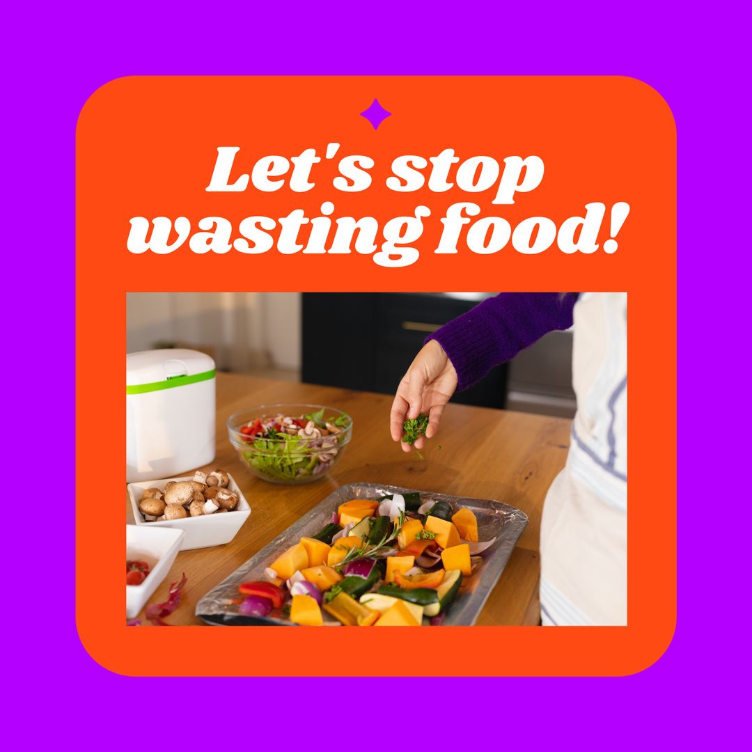 Caucasian woman chopping fresh vegetables in kitchen while message encourages reducing food waste. Useful for environmentally focused campaigns and sustainable living content.