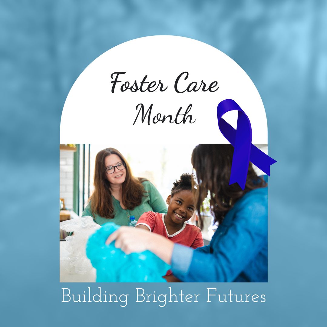 A loving moment between caring women and a cheerful girl, symbolizing the hope and unity within foster care. The blue ribbon highlights awareness and support during Foster Care Month. Ideal for articles and campaigns focused on fostering, unity, community engagement, and creating optimistic futures for children.